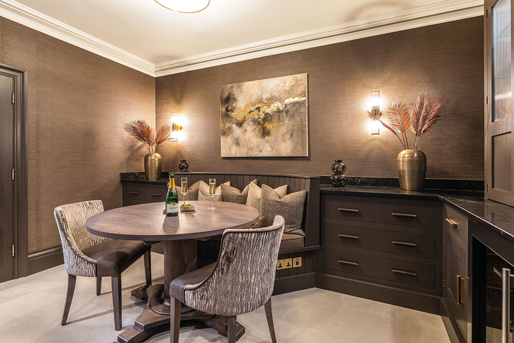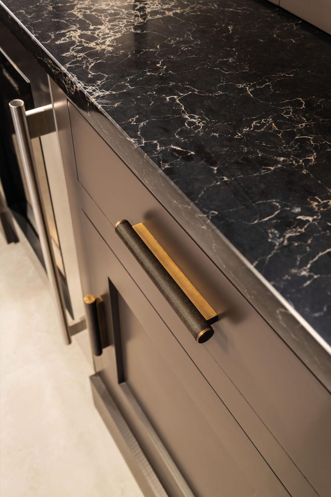 The centrepiece of this design is a bi-fold home bar. Crafted from our Kavanagh collection and finished in Hazelwood, a deep chocolate-brown hue, it exudes richness and depth. The cabinetry’s Dusted Oak interior and Burnished Brass Wire Scroll handles add tactile warmth, while the Caesarstone Vanilla Noir worktop, a dark surface laced with delicate vanilla veining, creates a bold yet timeless contrast.