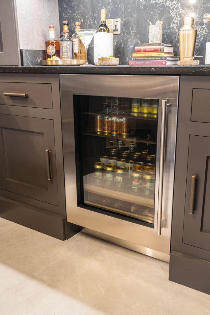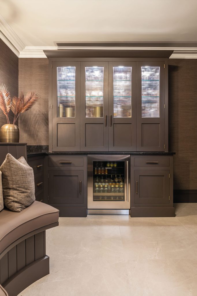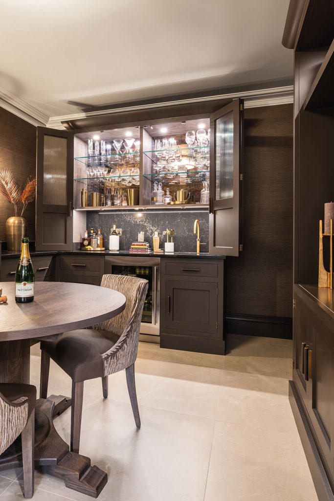 Behind elegant bi-folding doors lies a fully functional serving area, complete with a Quooker tap, Franke sink, Sub-Zero wine fridge, and tailored storage for bottles, glassware, and bar tools. Glass shelving set against antiqued bronze mirrors lends a touch of understated decadence, echoing the ambience of a private Soho speakeasy.