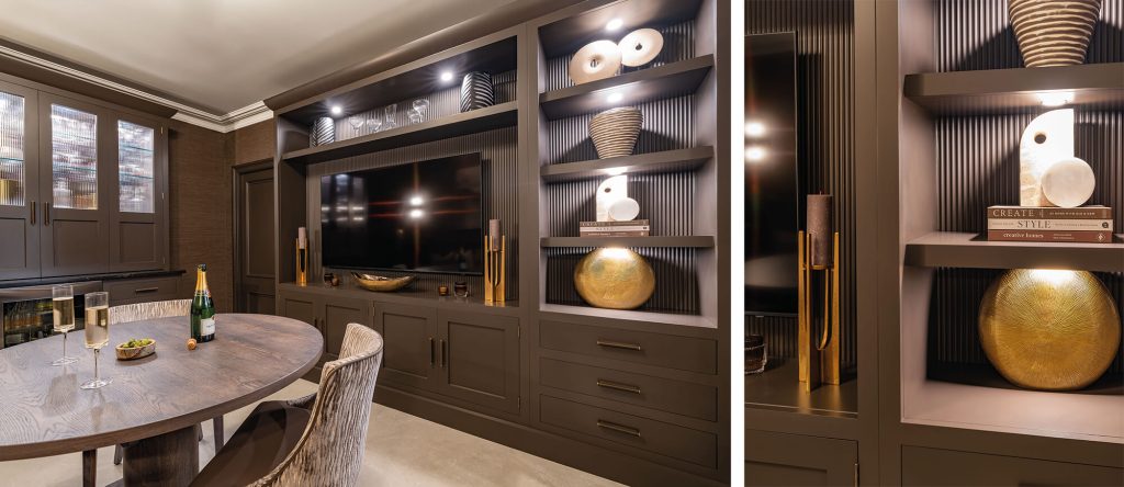 Spanning the back of the room, the bespoke media wall anchors the space. Finished once again in Hazelwood, it incorporates tactile reeded backboards, integrated LED lighting, and a combination of open and closed cabinetry.