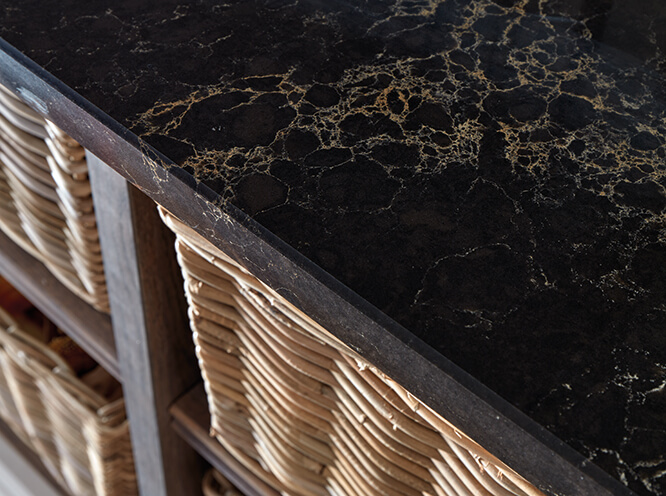 When paired with Hazelwood, Caesarstone 5100 Vanilla Noir creates a kitchen that is instantly sophisticated and full of drama. “Caesarstone 5100 Vanilla Noir is a striking surface, defined by its deep black base and subtle vanilla veining that adds movement and texture. When paired with Hazelwood, a rich, chocolate-brown, it creates a moody, sophisticated look.