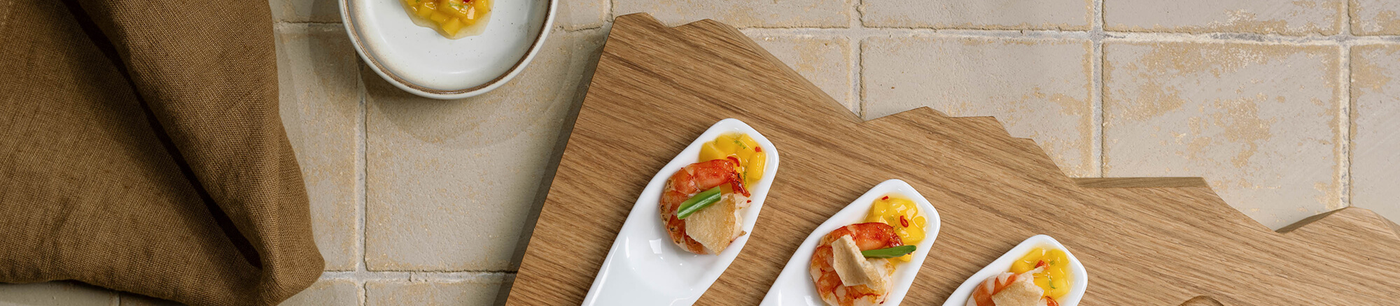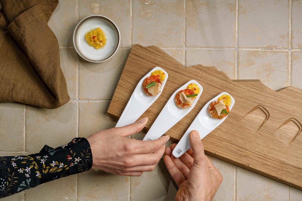 To serve, place a teaspoon of mango salsa on each Piccolo spoon and garnish with prawns, mangetout, and prawn crackers.