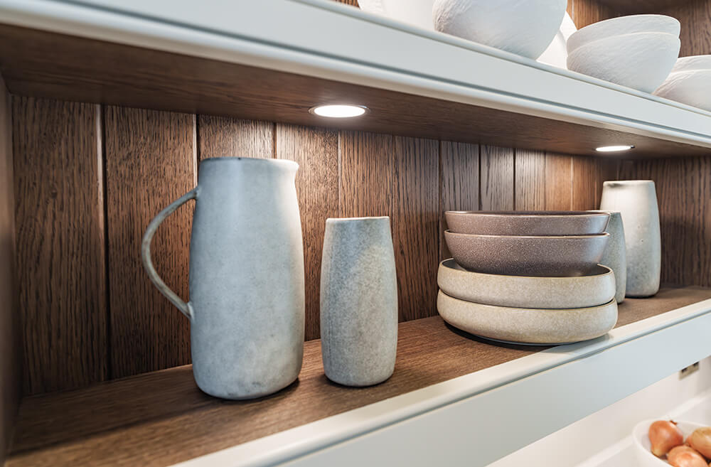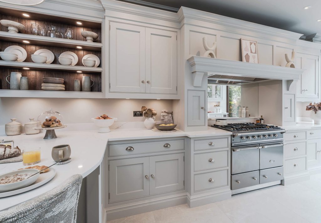 Open shelving, a signature of the Summerville collection, provides space for artwork, ceramics and personal objects, reinforcing the sense that this is a kitchen meant to be lived in, not simply admired.