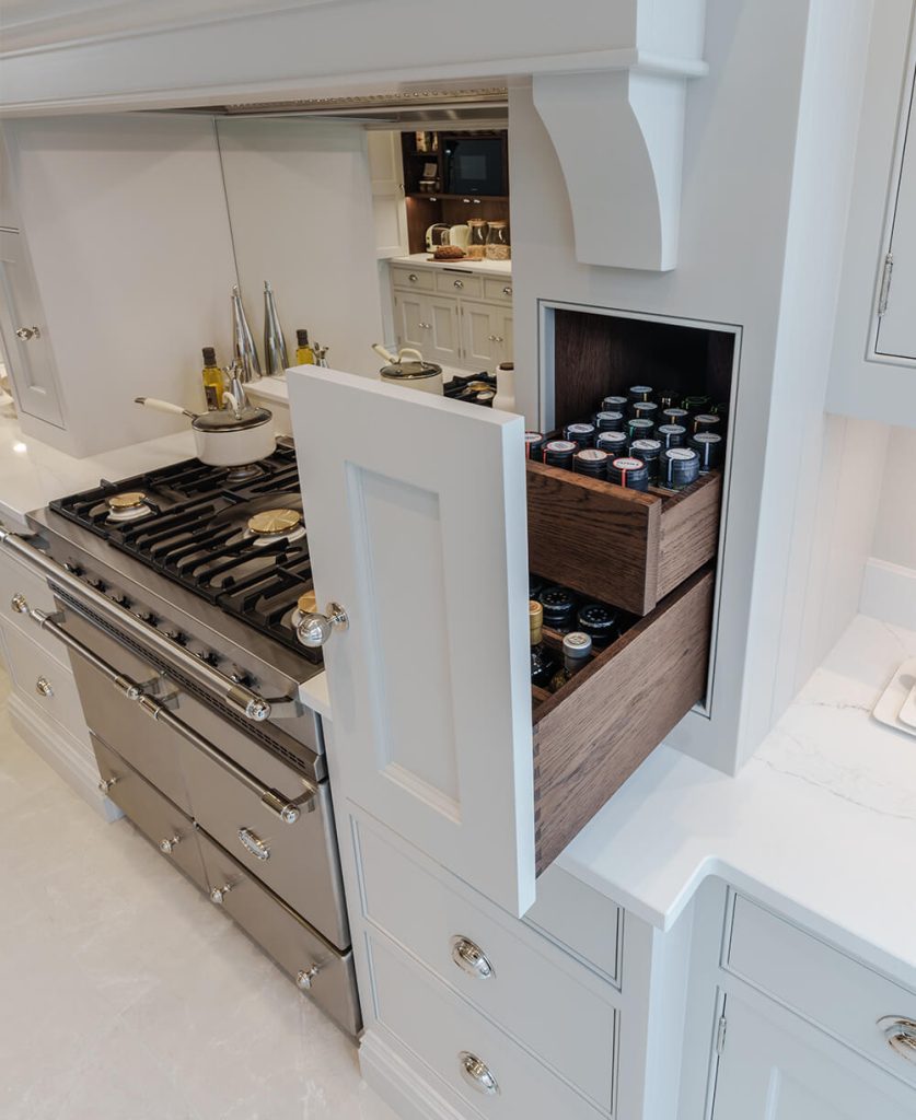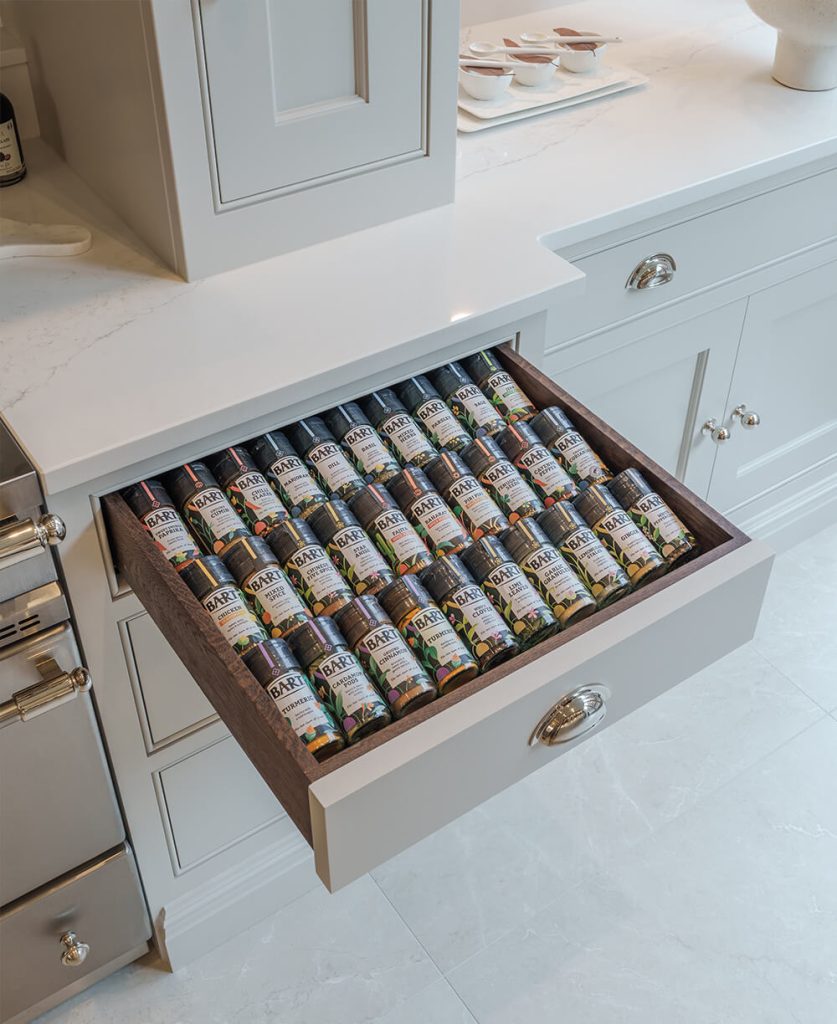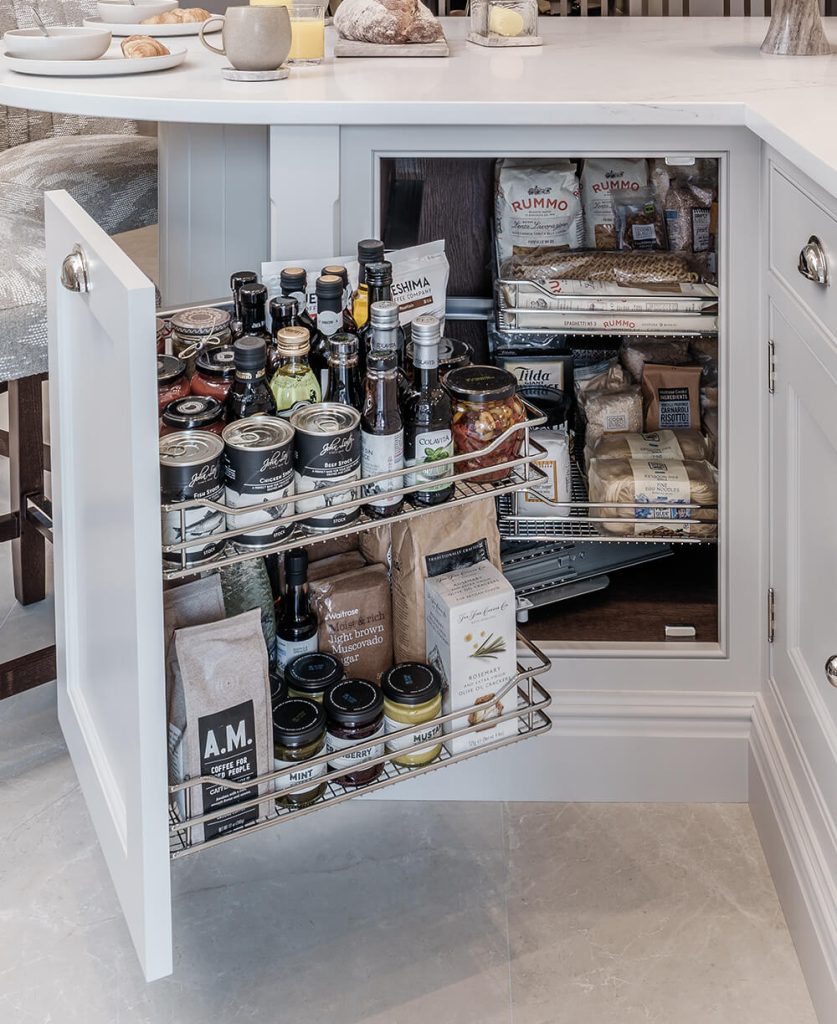 Bespoke internal storage includes a pull-out bin, utensil drawers, a knife block insert, spice drawers and a tailored cutlery drawer, each designed to support everyday cooking without cluttering surfaces. Corner cabinets, traditionally one of the most difficult areas to resolve, are fitted with integrated pull-out racks, while Tudor oak trays positioned beside the sink ensure every inch of space is used effectively.