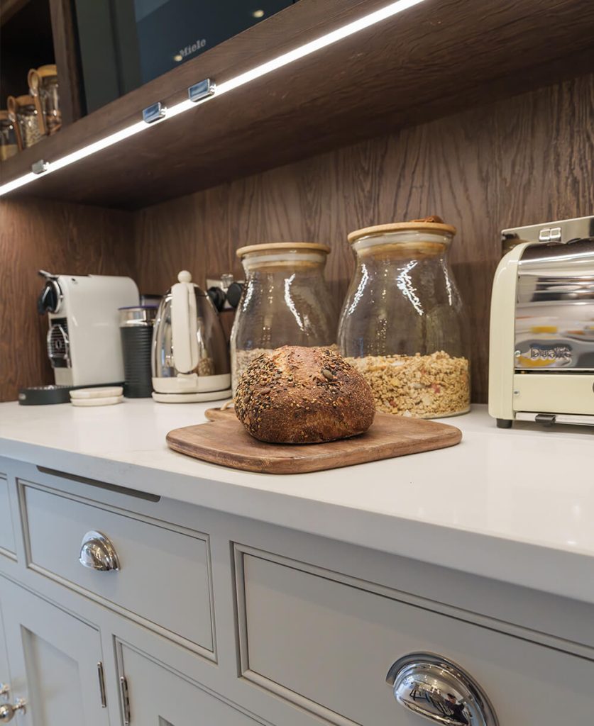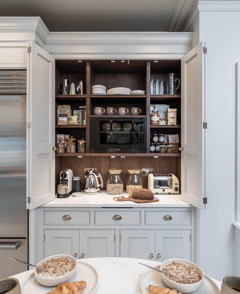 The breakfast pantry is a considered response to modern routines. Designed to house small appliances, including an integrated Miele microwave, it allows the main kitchen to remain calm and uncluttered while creating a relaxed, informal space for everyday use. A durable quartz surface provides a practical area that wipes down easily after the morning rush, while adjustable shelving allows the interior to adapt to changing storage needs.