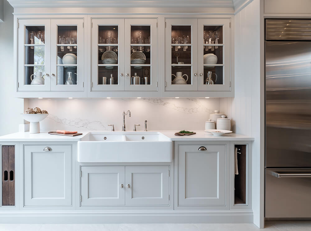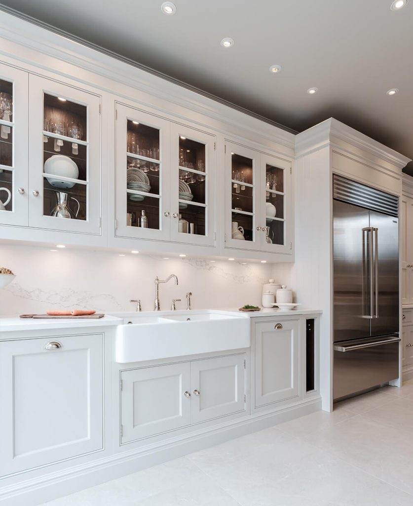 Rather than relying on long, uninterrupted runs of cabinetry, this kitchen embraces a broken-plan approach. Open shelving with Tudor oak panel detailing introduces warmth and texture, while glazed cabinets above the sink, finished with delicate, slim glazing bars, bring lightness and refinement.