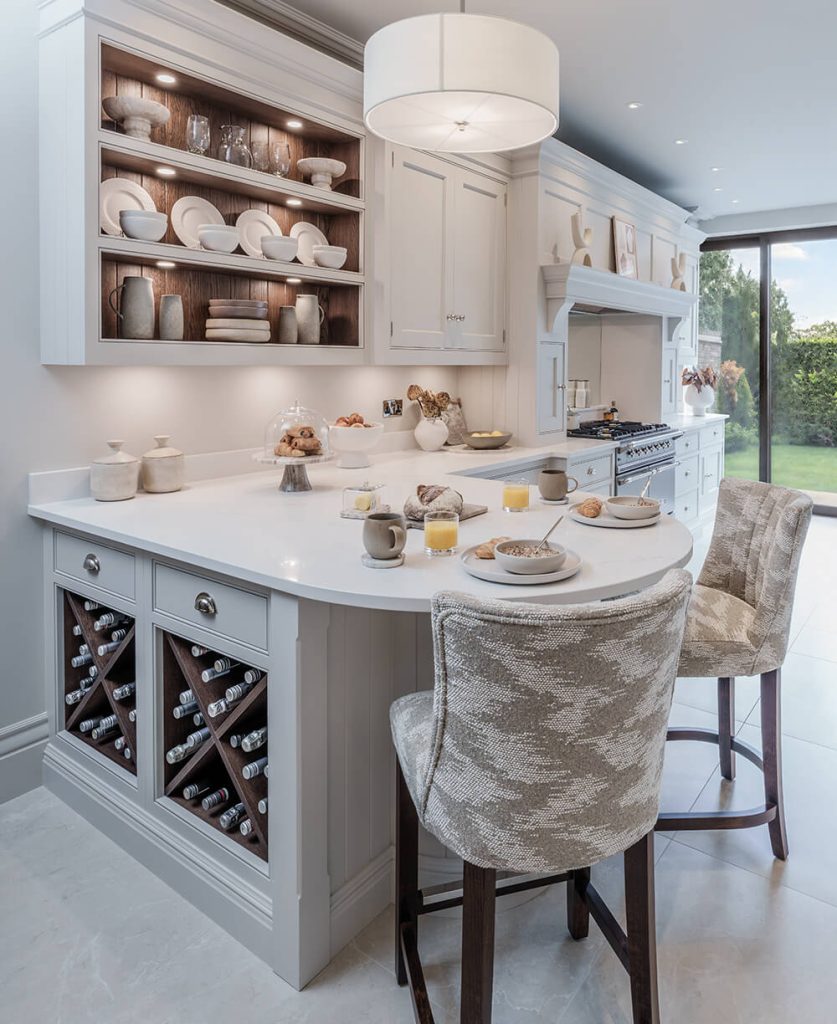 The island peninsula is the anchor of the space, cleverly zoned to balance function and sociability. Its curved form softens the layout while creating a natural gathering point. Rounded seating encourages guests to perch comfortably with a drink, allowing conversation to flow while the host cooks.