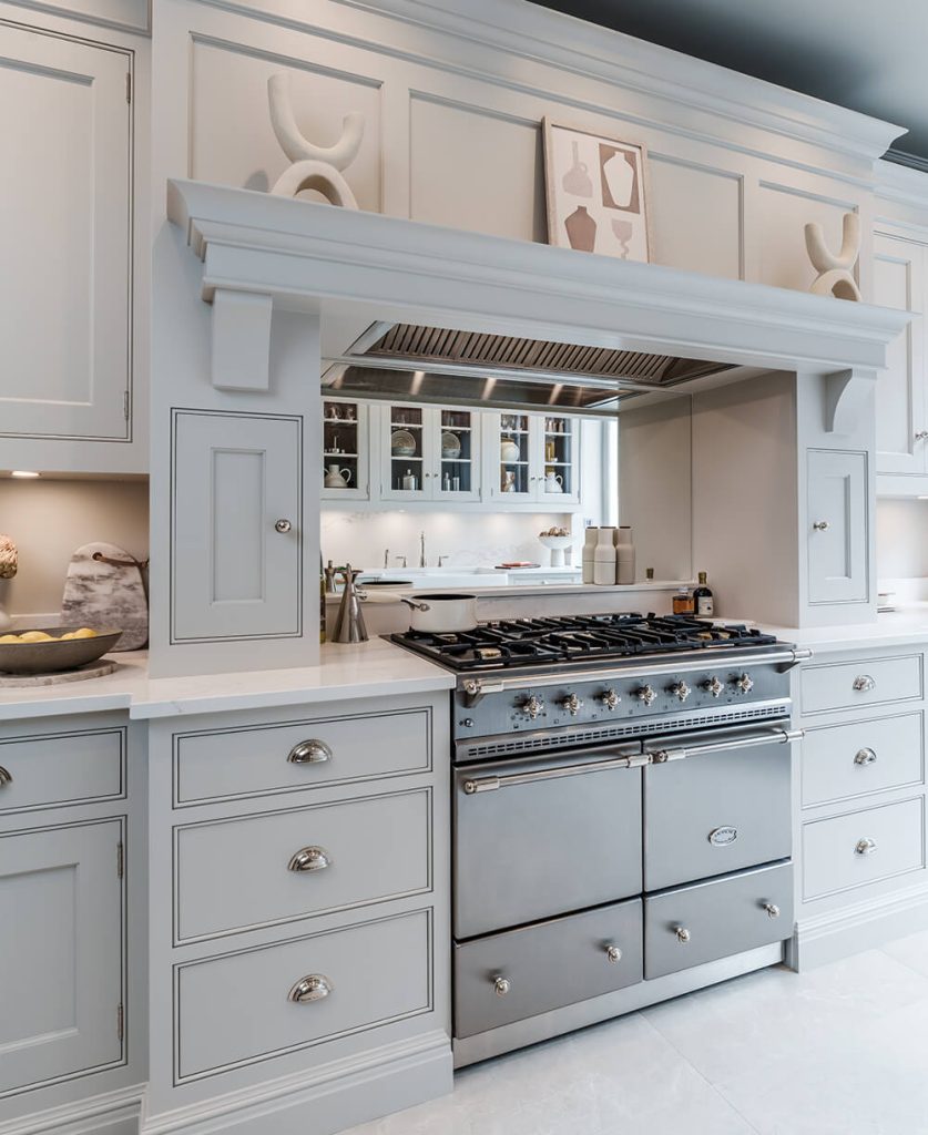 The cooking area is framed by a bespoke chimney, complete with corbels and a mantel shelf. This architectural feature creates a strong focal point while discreetly concealing the Westin extractor fan. Integrated niche storage within the chimney adds another layer of practicality, keeping cooking essentials close at hand without disrupting the visual flow of the room.