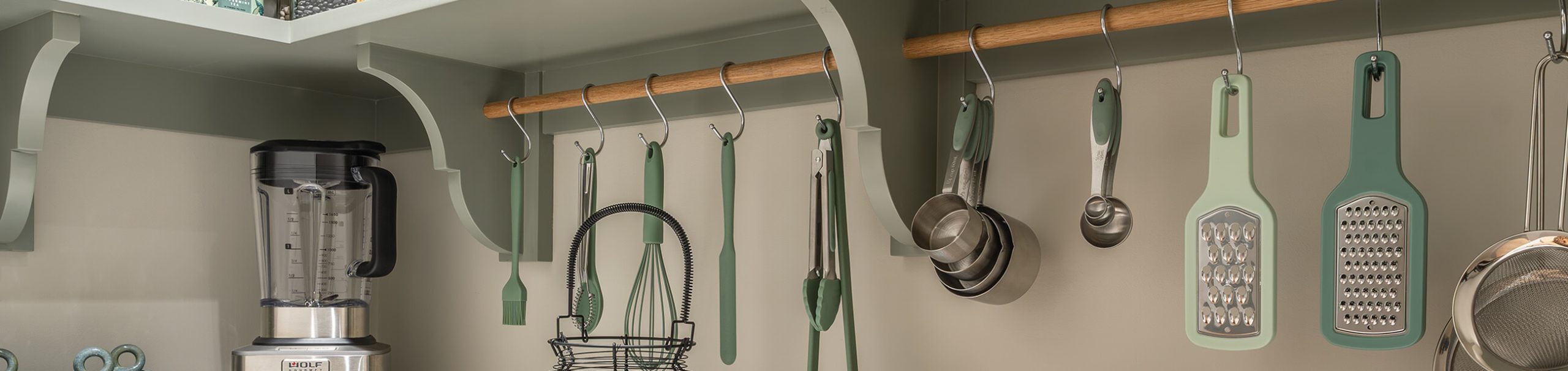 A bright white quartz countertop provides practical prep space while housing small appliances such as blenders and toasters. A hanging rail beneath the lowest shelf, fitted with polished nickel S-hooks, allows utensils to be displayed and accessed with ease, keeping everyday tools both functional and aesthetically pleasing.