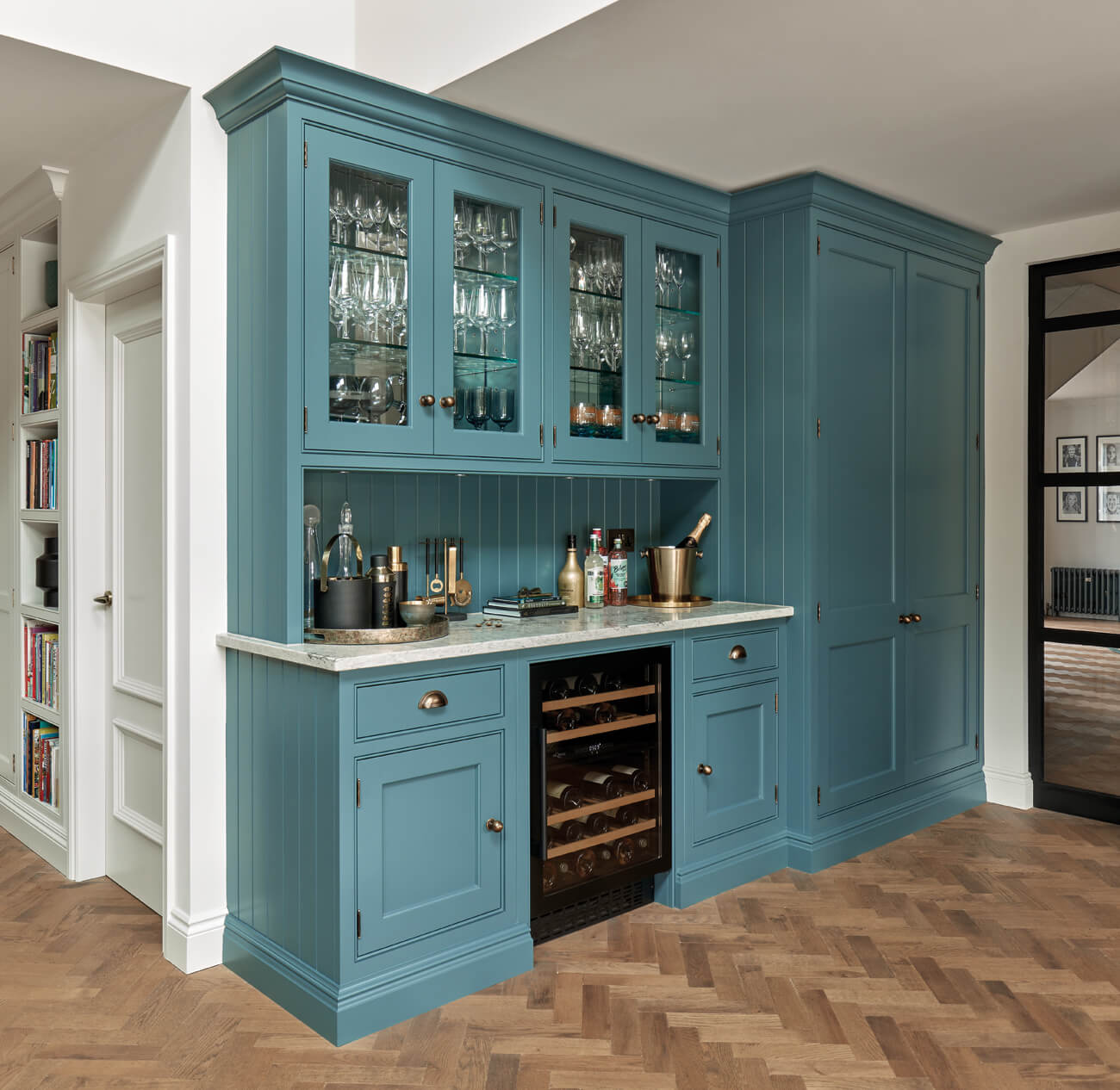 Picture this: You're hosting a gathering and as your guests walk in, their eyes are immediately drawn to this signature bar design from Tom Howley. The cabinetry, painted in our unique Inky Sky hue, is a conversation starter with its dramatic blend of blue and grey tones. The burnished brass handles are a nod to timeless style, while the Caesarstone Moorland Fog worktop isn't just a surface, it's your canvas for crafting your favourite drinks. The mirrored back panels of the glazed cabinets catch the light just right, making your glassware collection sparkle. Plus, with the McQuvee refrigeration, your wine is always served at the perfect temperature.