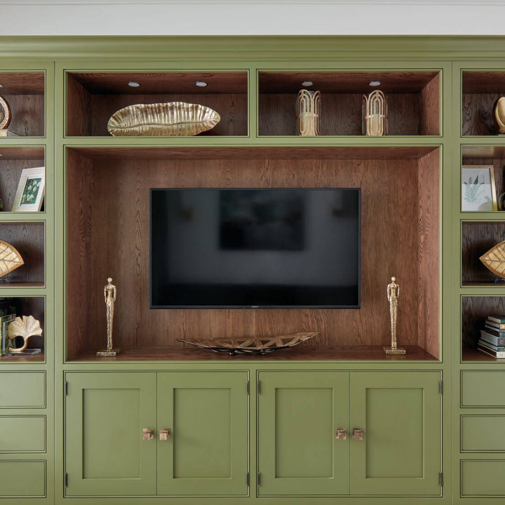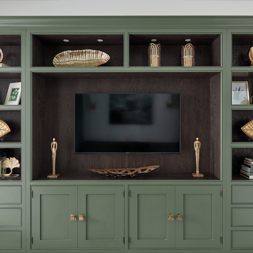 This sumptuous green TV area defines the space in the kitchen where after-dinner relaxation takes place. Settle down with a glass of wine and a bowl of potato crisps and snuggle up with your favourite box set or the latest Hollywood blockbuster. Open shelving is the perfect frame for a state-of-the-art widescreen TV, while the soft lighting from the glazed cabinets casts an ambient glow across the room.