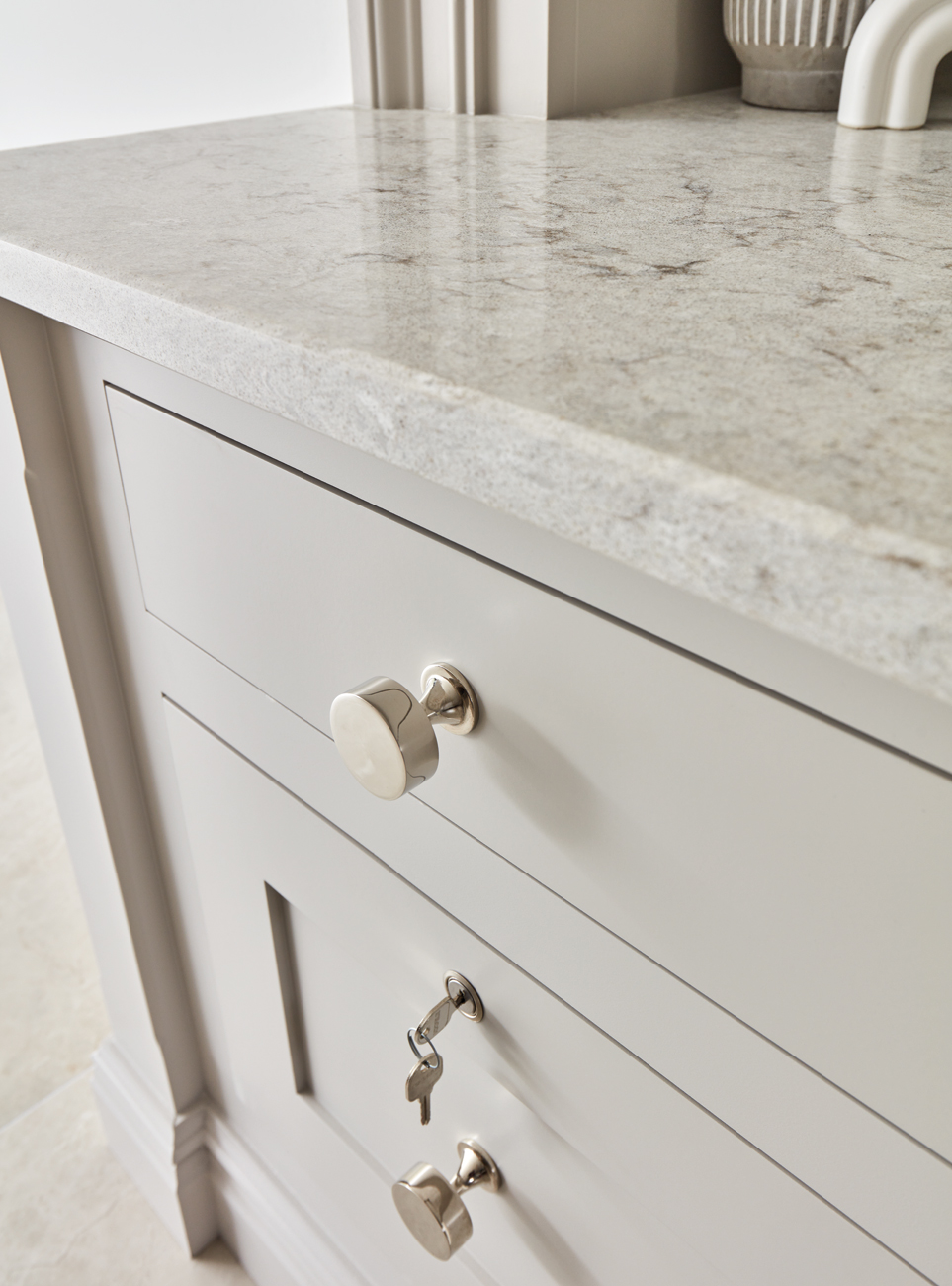 Painted in our sophisticated and timeless colour, Tansy, this study is finished with our exclusive Antrim polished nickel handles, creating a timeless and elegant design. Integrated lighting creates a warm, inviting ambiance, while secure storage cabinets ensure your essentials are safely tucked away. The luxurious quartz worktop adds a touch of refinement, embodying the Butler collection's clean, simple design aesthetic.