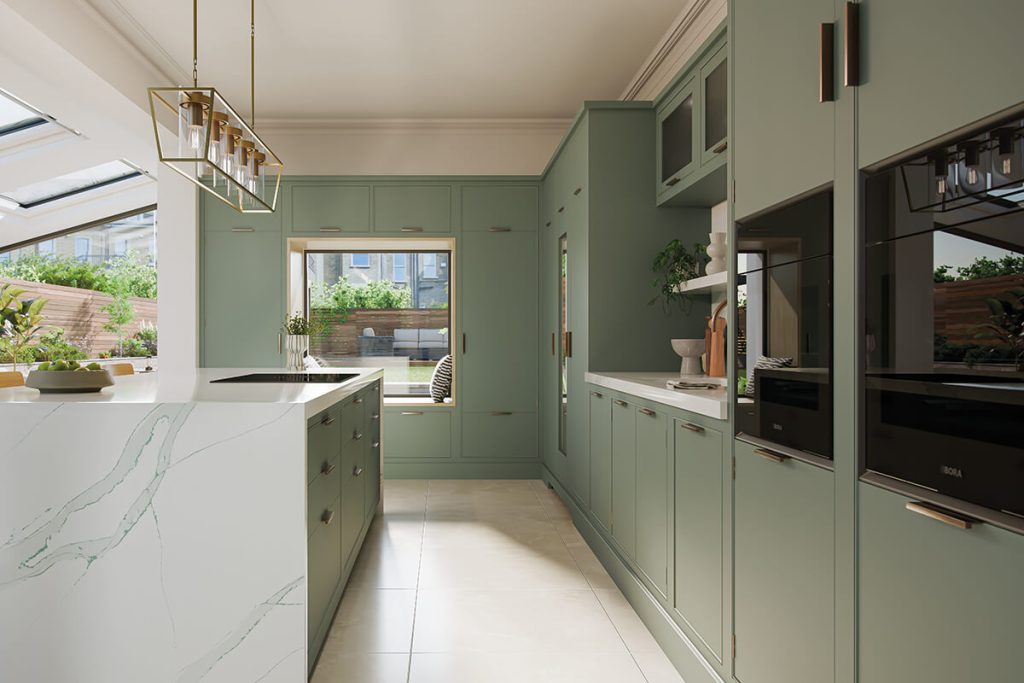 When paired with wood tones and Caesarstone Organic White worktops, the palette perfectly balances warmth and modernity. Matt black handles and fixtures, including the Quooker tap, further enhance the room’s contemporary aesthetic while harmonising with the Crittall window and door details.