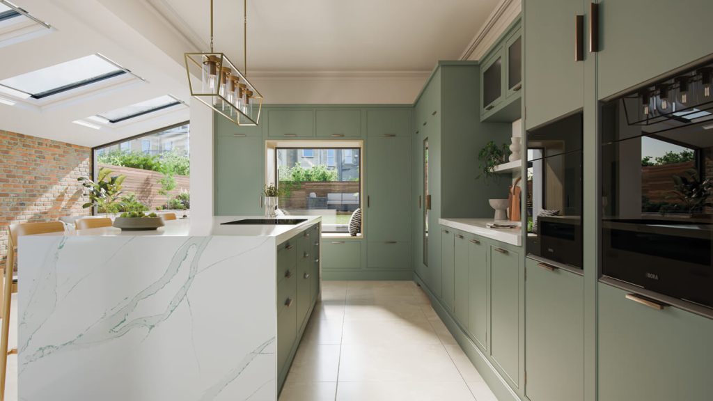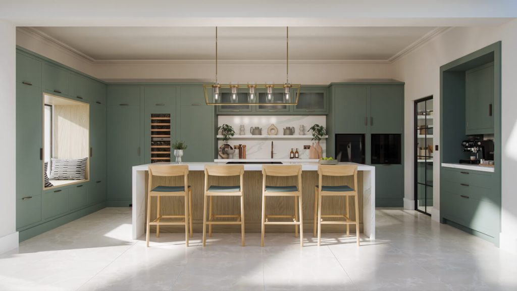 The palette is soft and nature-inspired: Green Meadow cabinetry, warm neutrals and pale quartz surfaces, lifted by burnished brass accents. Large-format porcelain floor tiles are proposed to enhance light and space, while Natural Oak introduces warmth and tactility. Together, these elements create a calm, organic environment that feels deeply connected to its surroundings.