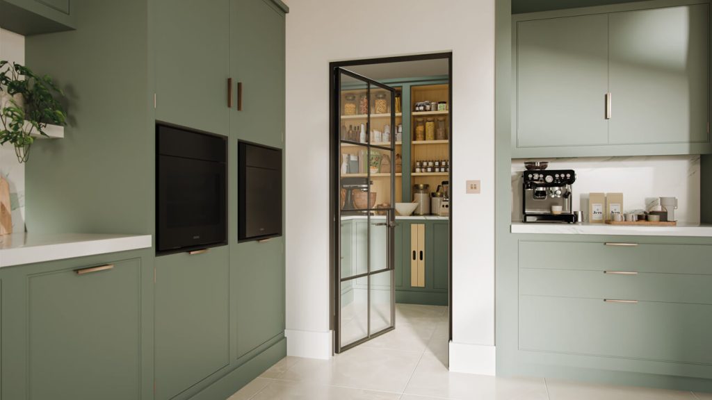 Set behind slim, black-framed Crittall-style doors, the walk-in pantry is both practical and quietly luxurious. Inside, open shelving keeps everyday ingredients within easy reach, while deeper cupboards and drawers store bulk items and hosting essentials. A dedicated work surface allows for light prep and accommodates heavier appliances, keeping the main kitchen serene and clutter-free.