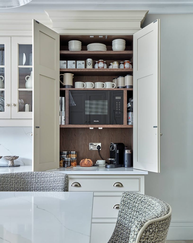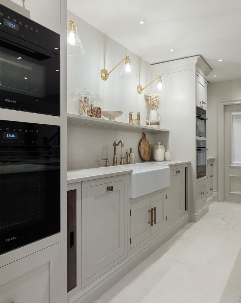 Smart storage is seamlessly integrated throughout the space, including a concealed home bar hidden behind closed cabinetry for a clean, streamlined look. Miele appliances are symmetrically positioned on either side of the sink, while a Quooker tap offers instant boiling water and helps minimise worktop clutter.