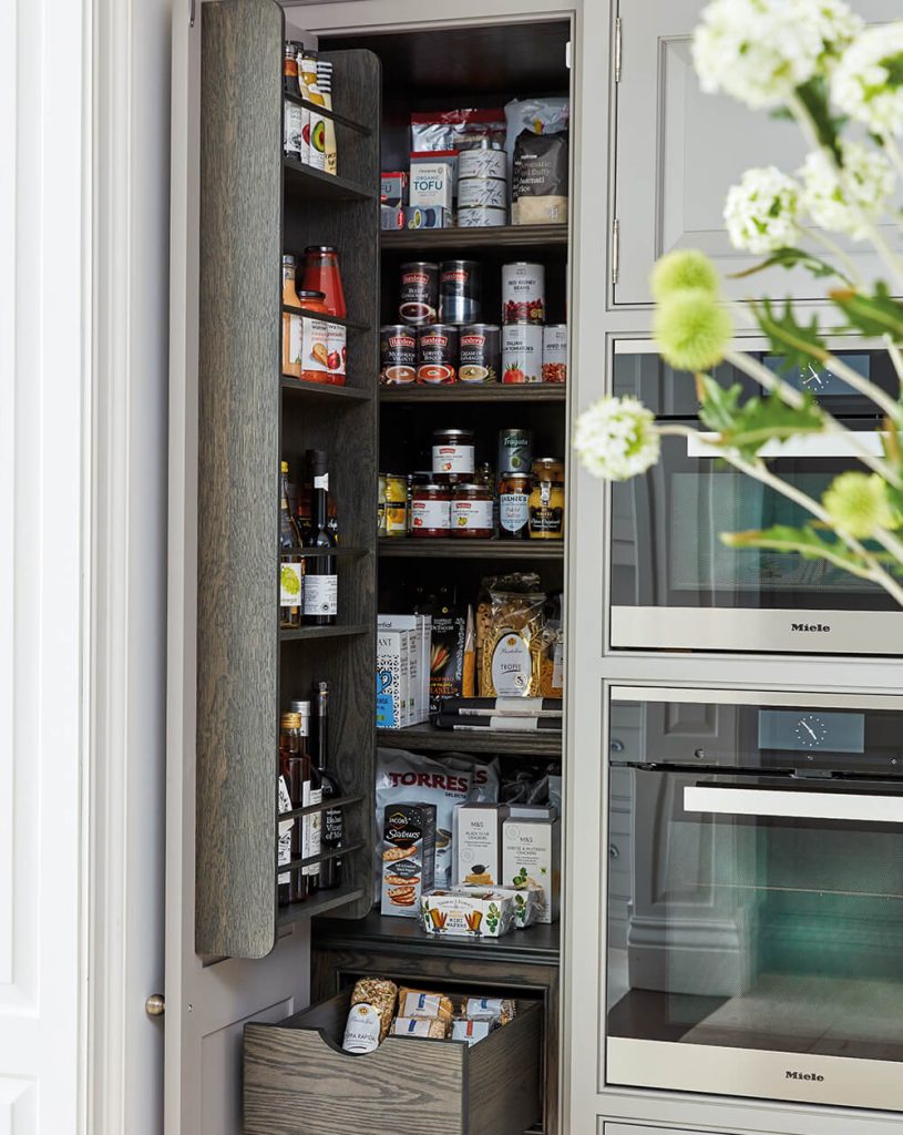 The galley layout uses tall larder cabinets, deep drawer storage, and integrated Miele appliances for a seamless, efficient design. One side of the kitchen includes internally lit glazed cabinets, perfect for adding personal touches, while the opposite run features a full-height double pantry and a bi-fold breakfast unit with generous drawers beneath.