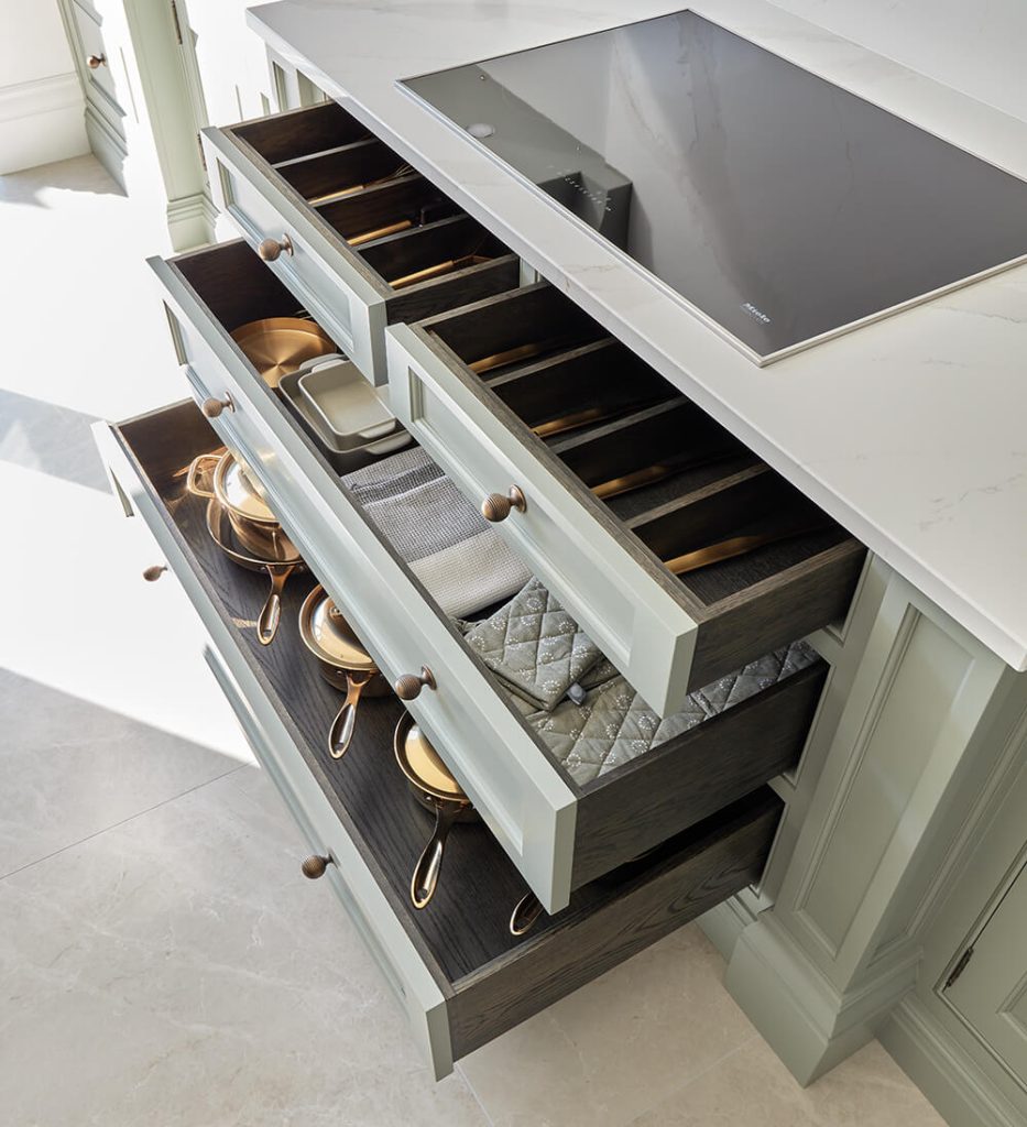 Embrace drawers and dividers: Opt for drawers with bespoke inserts for organising utensils, spices, and knives or deeper solutions for bulky pots, pans and trays. This keeps everything within easy reach and organised.