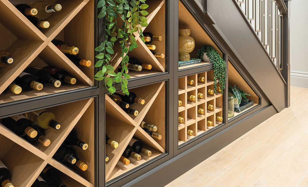 When designing wine storage, it’s essential to consider the types of bottles you plan to store. Champagne bottles, for example, are noticeably larger than a standard 70cl bottle of red, so planning ensures your display works both visually and functionally.